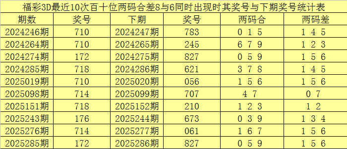 从以上统计不错看出,百十位两码合差8与6同期出现之后其下期两码合差发达最热的4个分袂为:1567,本期百十位两码合差不错参考这四码中的数据。