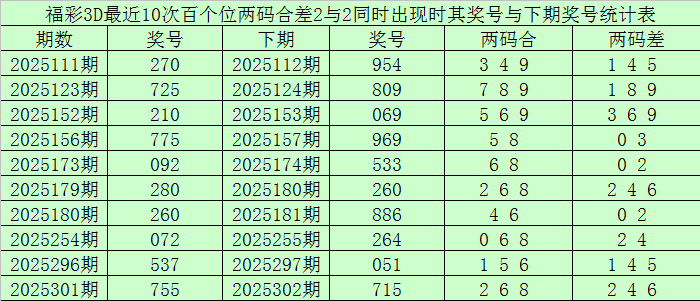 从以上统计不错看出,百个位两码合差2与2同期出现之后其下期两码合差发达最热的4个分袂为:2468,本期百个位两码合差不错参考这四码中的数据。