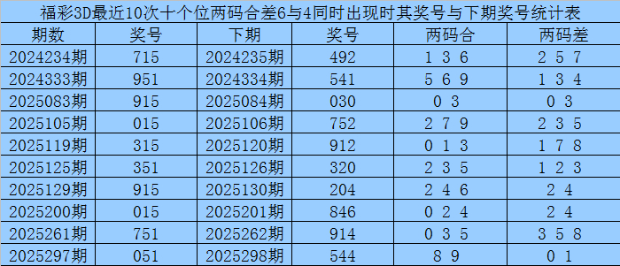 十个位合差分析:上期奖号十个位开出15组合,两码合为6,两码差为4,最近10次十个位两码合6与两码差4同期出面前,其奖号和下期奖号分袂为: