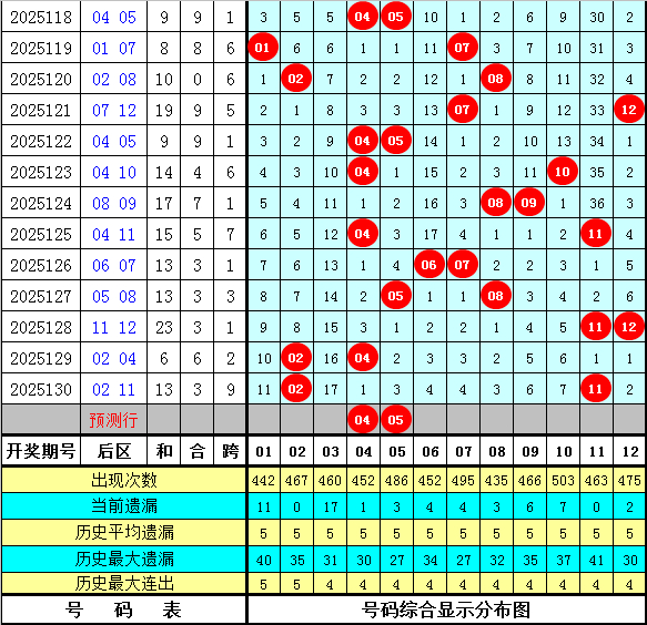 其中,号码奇偶比为48:52,大小比为49:51,012路比为26:32:42,本期前区龙头号码参考01。