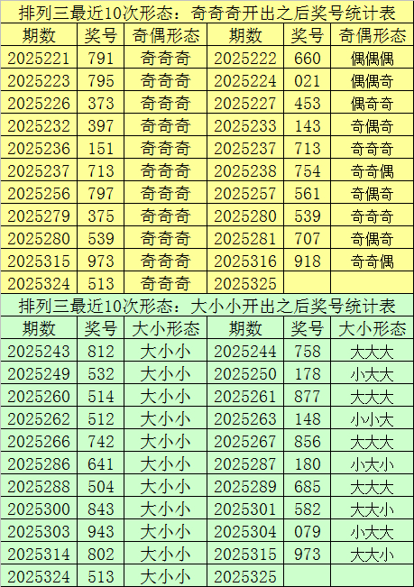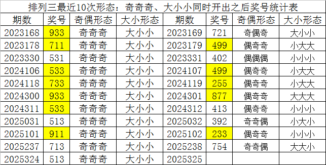 胪列三最近10次同期开零散偶方式:奇奇奇和大小方式:大小小时其奖号分裂为:933-711-531-533-733-933-533-513-911-713-513,下期分裂开出号码为:721-499-402-499-255-877-413-392-233-754,详备统计见下表: