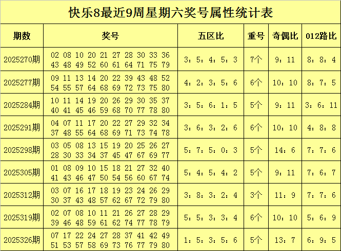 福彩快意8第2025326期(上周六)奖号转头:07 17 22 24 27 28 37 41 42 49 51 53 57 58 69 73 76 77 79 80,其中奖号奇偶比为13:7,五区比为1:5:3:5:6,012路比为6:9:5,包含5个重号07、27、28、77、79。